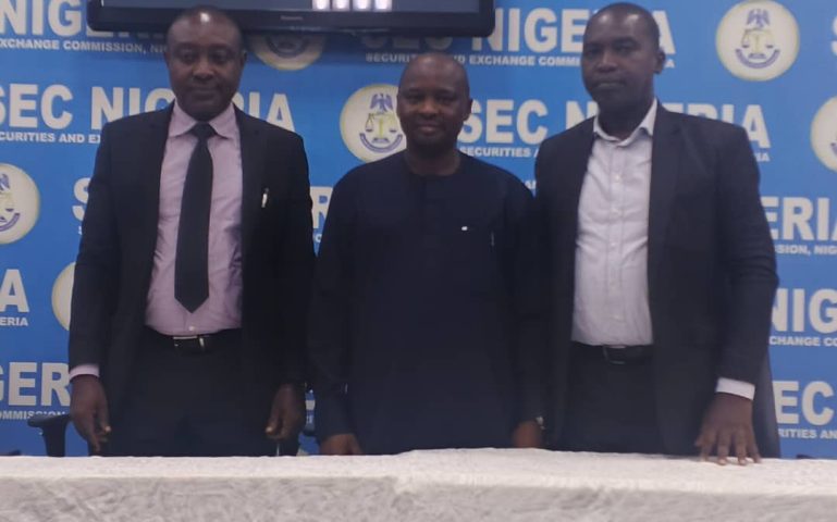 BY NGOZI ONYEAKUSI L-R: Mr John Achile, Principal Manager atthe Securities and Exchange Commission (SEC) represented Mr John Briggs, Head of Lagos Office, SEC; Dr. Sa'ad Abdulsalam , Head of…